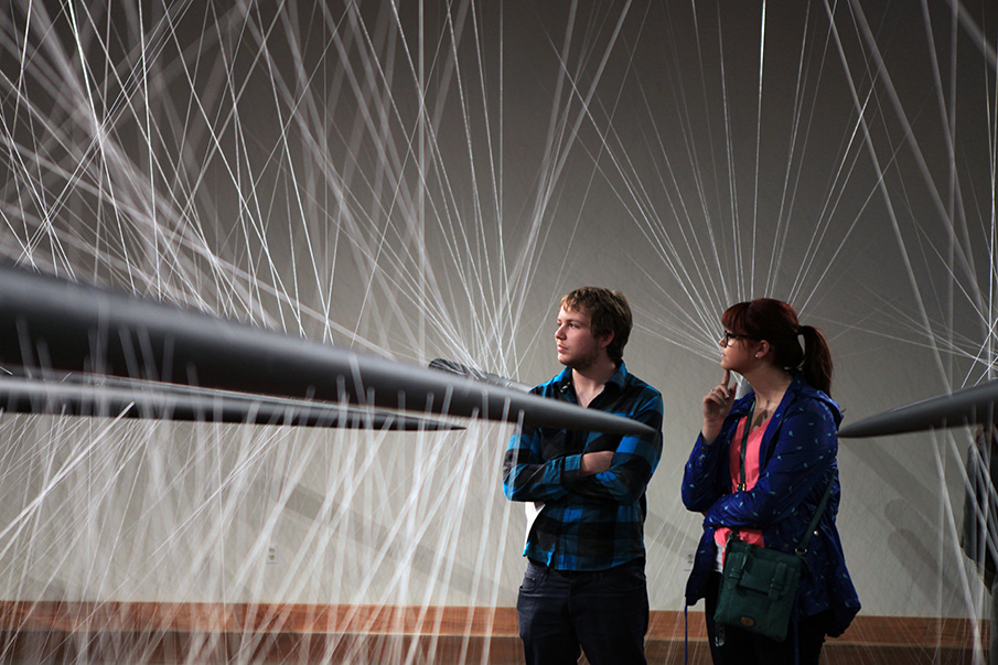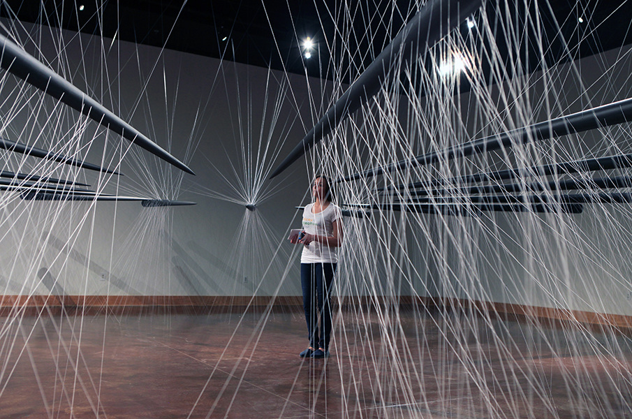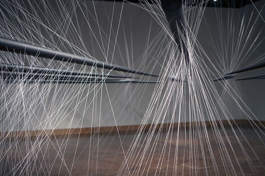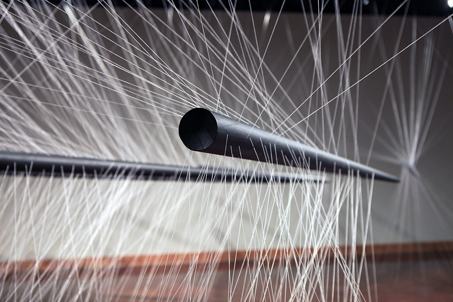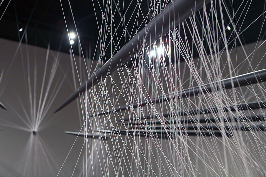 Amass consists of sixteen cylindrical elements (10’ long and 4” diameter). Each spear-like wooden element is hand-sculpted and sharpened to a single point and coated with metallic graphite patina. Held in space by numerous thin white cotton threads stretching backwards towards the walls, ceiling, and floor, together, they form a radiating, circular composition. The elements zoom from all directions toward a center void, a volume of intensely charged energy, like a storm’s eye. On one side of the composition, an opening allows the spectator to enter, confront, and be confronted by the compressing force from the sixteen fierce points. The web of delicate cotton threads restrains the zooming motion of the elements, quiets the hovering threat, and the entire composition levitates in an energetic balance.