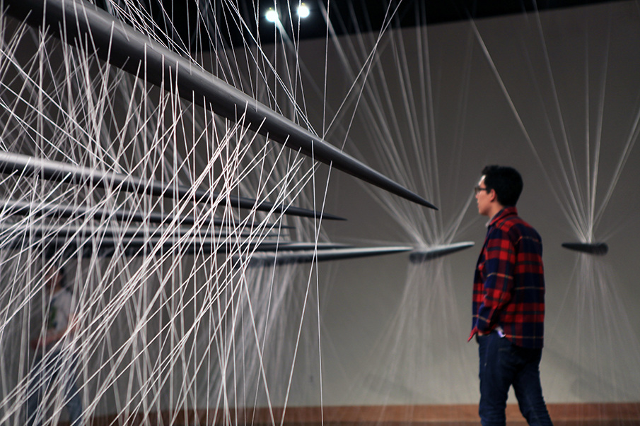 “Amass exudes a sense of serenity. And yet it simultaneously resonates with energy, tension and even a fleeting trace of residual movement as though the giant lances just stopped rocketing toward a target, miraculously held back by the gossamer threads. Liu’s work operates via multiple layers of dichotomy. Motion versus stillness. Threat balanced by quiet order. Delicacy contrasted with mass… Time and gravity remain integral to everything Liu creates.”
