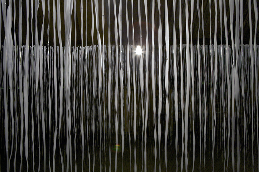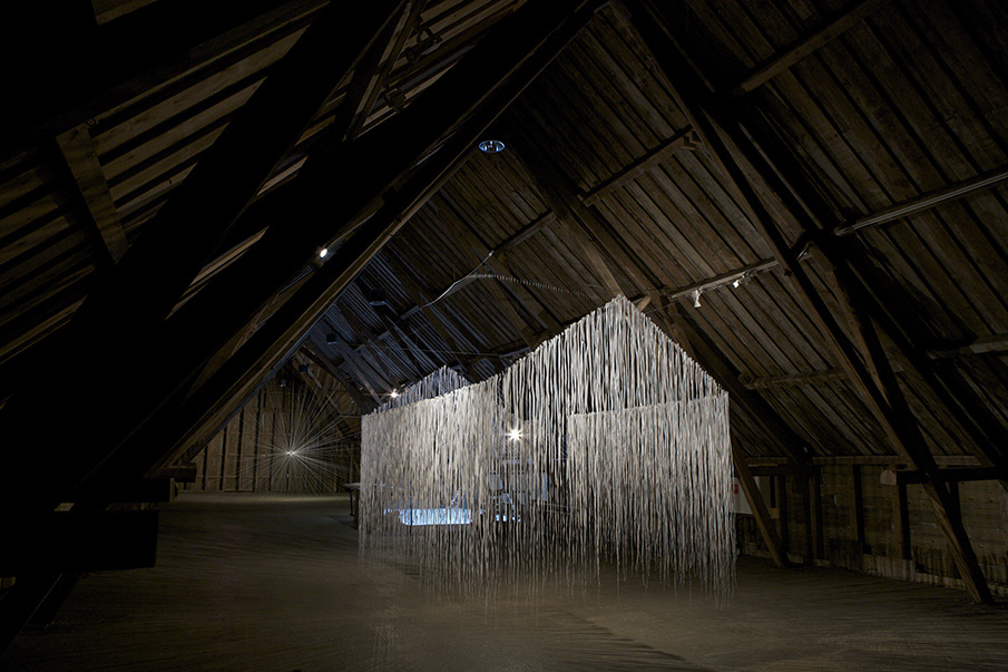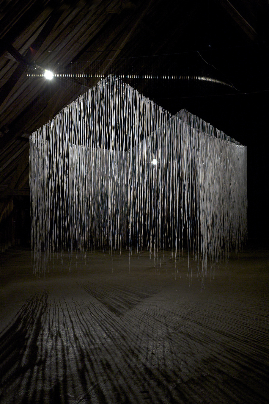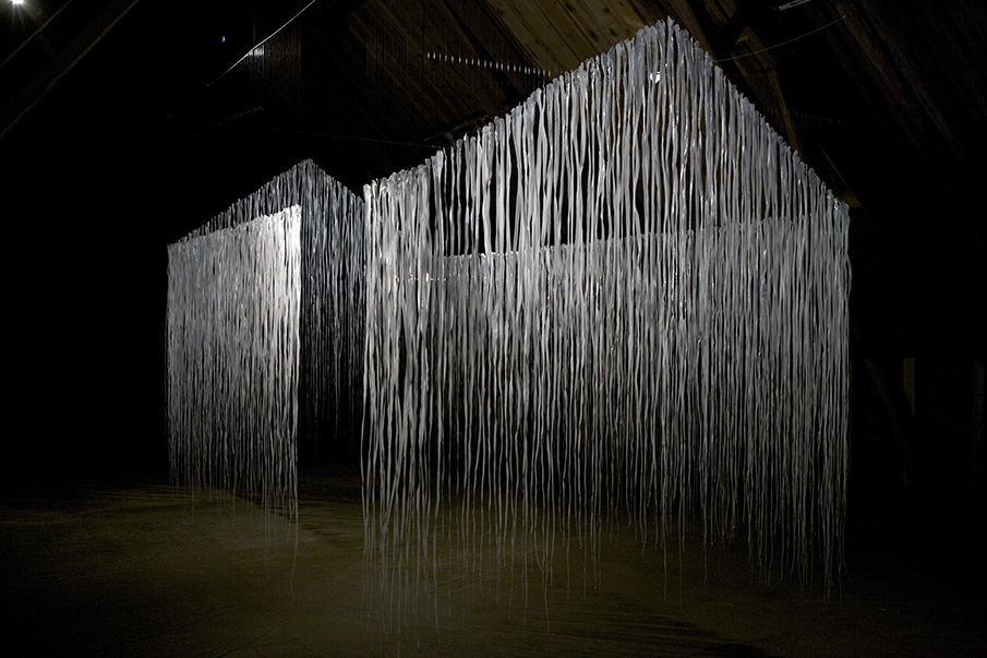 Recall assumes a simple, double-sloped, one-room-house structure, an archetypal symbol of home. The installation is composed of approximately 600 hand-made, pure Paraffin wax strands, each measuring 1.5 to 2 meters in length. These delicate lines of wax can shatter at the slightest touch. Suspended in the center of the space. Recall draws an elusive image of a small rural house, referencing the artist’s birthplace—a small adobe house in rural northeast China. Through the fragility of the wax material, Recall speaks to our shared longing for home, shelter, and belonging.
