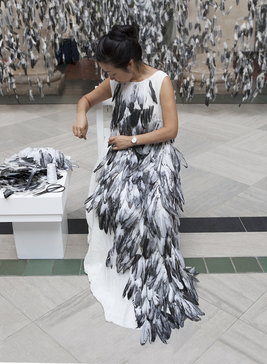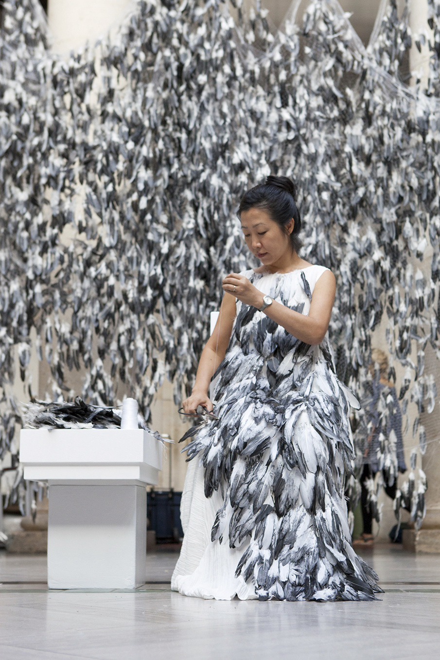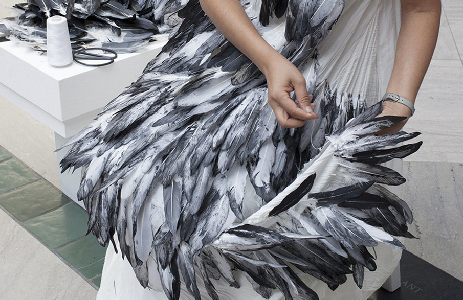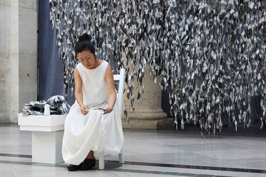 Thousands of plain, white feathers, each dipped in pine tar and wiped dry, are suspended from the ceiling, forming a cascading screen. The artist sits in front of the backdrop of tarred feathers, and performs an ongoing action of sewing tarnished feathers onto her white garment. Light as A Feather looks at the unfathomable loss and suffering of the growing numbers of displaced population. Underlying The performed act is a desire to transform feminine labor into a redemptive and healing process.